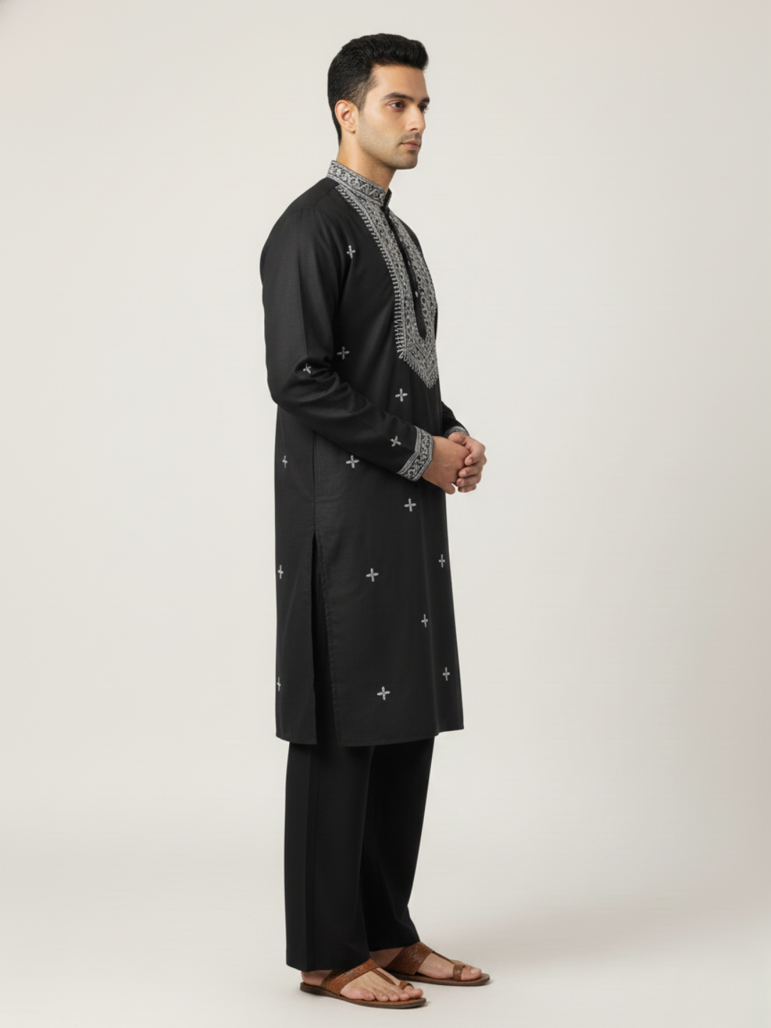 Collar: Feature Mandarin collar (or 'Bandh Gala' / 'Nehru Collar') which is a short, standing collar.