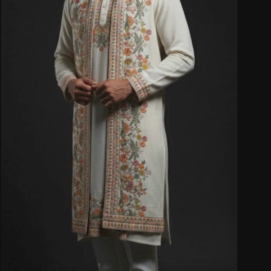This botanical art embroidery piece exemplifies luxury craftsmanship with its meticulously hand-stitched botanical motifs and coordinating designer dupatta. The sophisticated interplay of traditional embroidery techniques and refined aesthetics creates a statement garment for the discerning collector. A curated investment in wearable art that transcends seasonal trends.