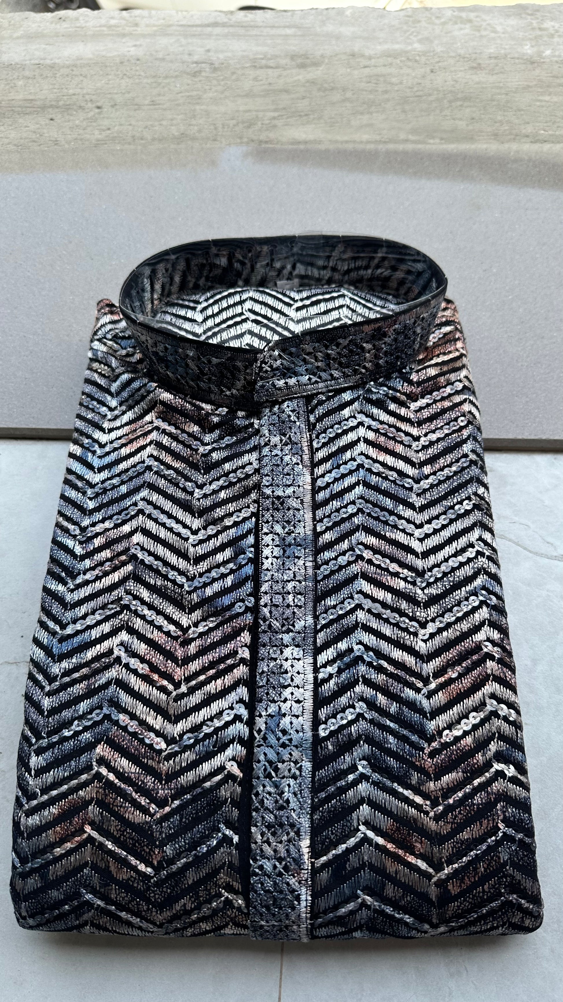 This premium kurta features a striking zigzag (chevron) pattern embroidered or woven throughout the fabric, giving it a rich texture and subtle metallic sheen.