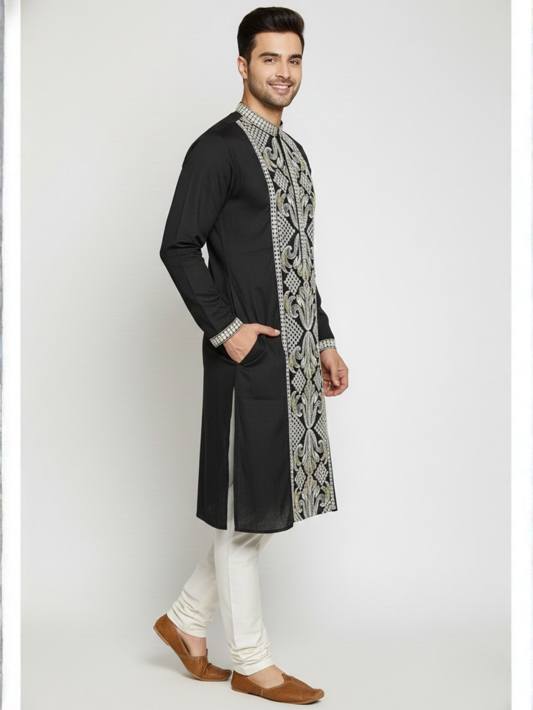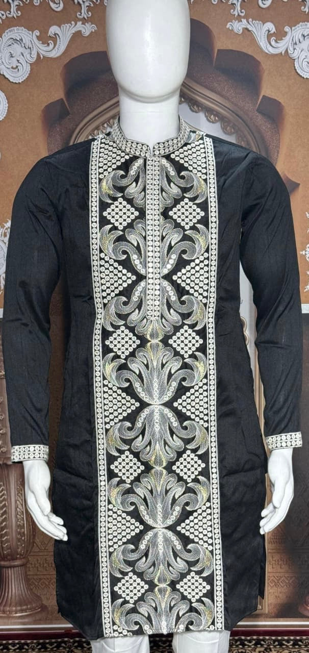 Long black kurta with heavy silver/grey resham embroidery on the front,back placket and cuffs.