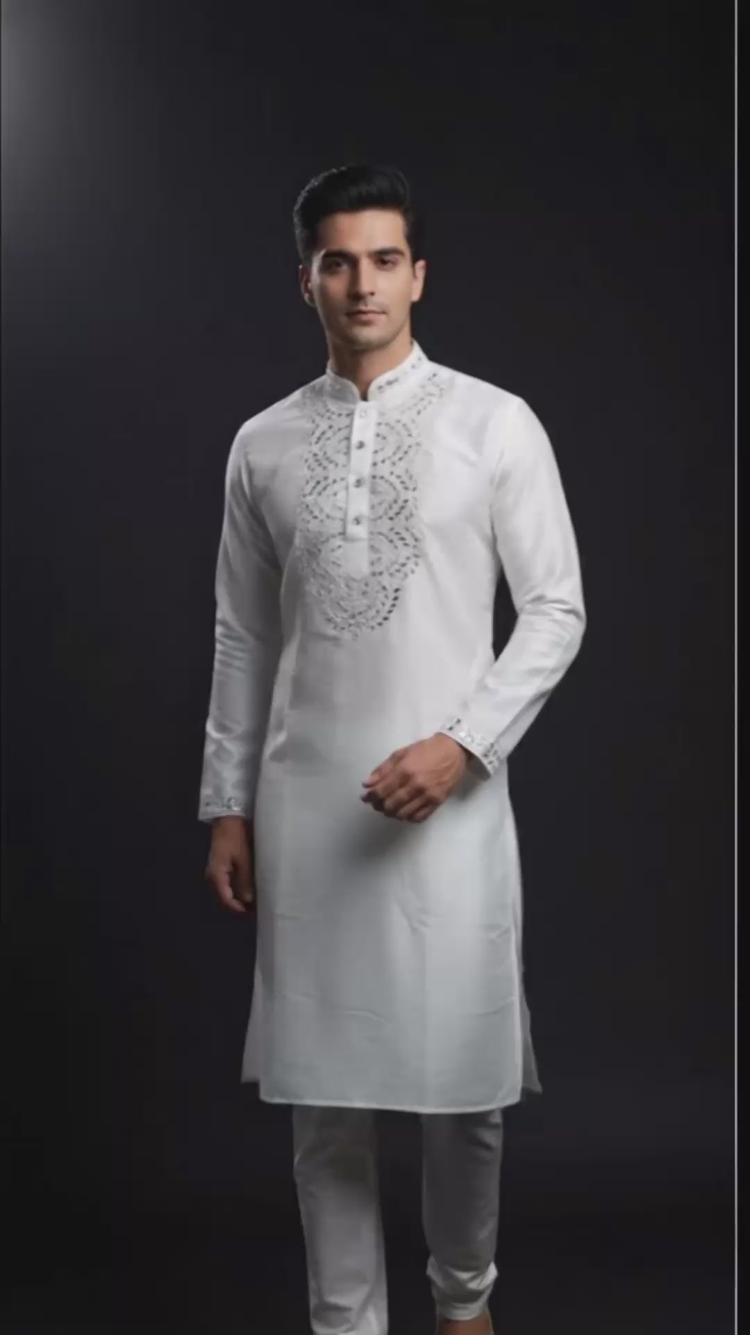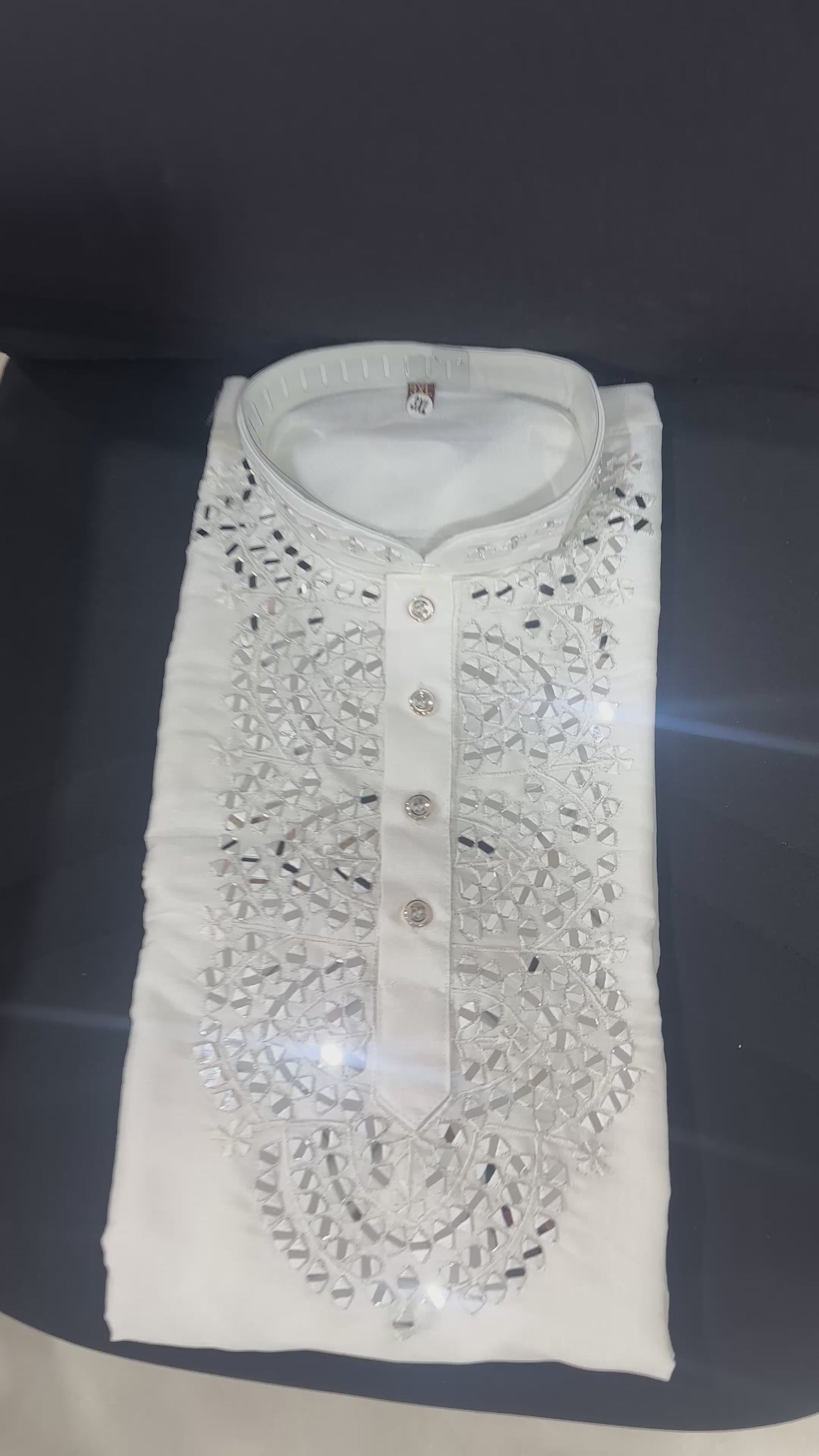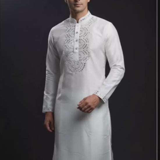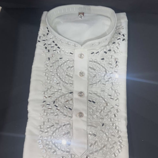 Expertly crafted from pure white silk, this kurta boasts intricate real mirror work that adds a touch of elegance and sophistication to any outfit. The expert mirror work showcases the beauty of traditional craftsmanship, while the luxurious fabric provides a comfortable and stylish fit. Elevate your wardrobe with this pristine white silk kurta.